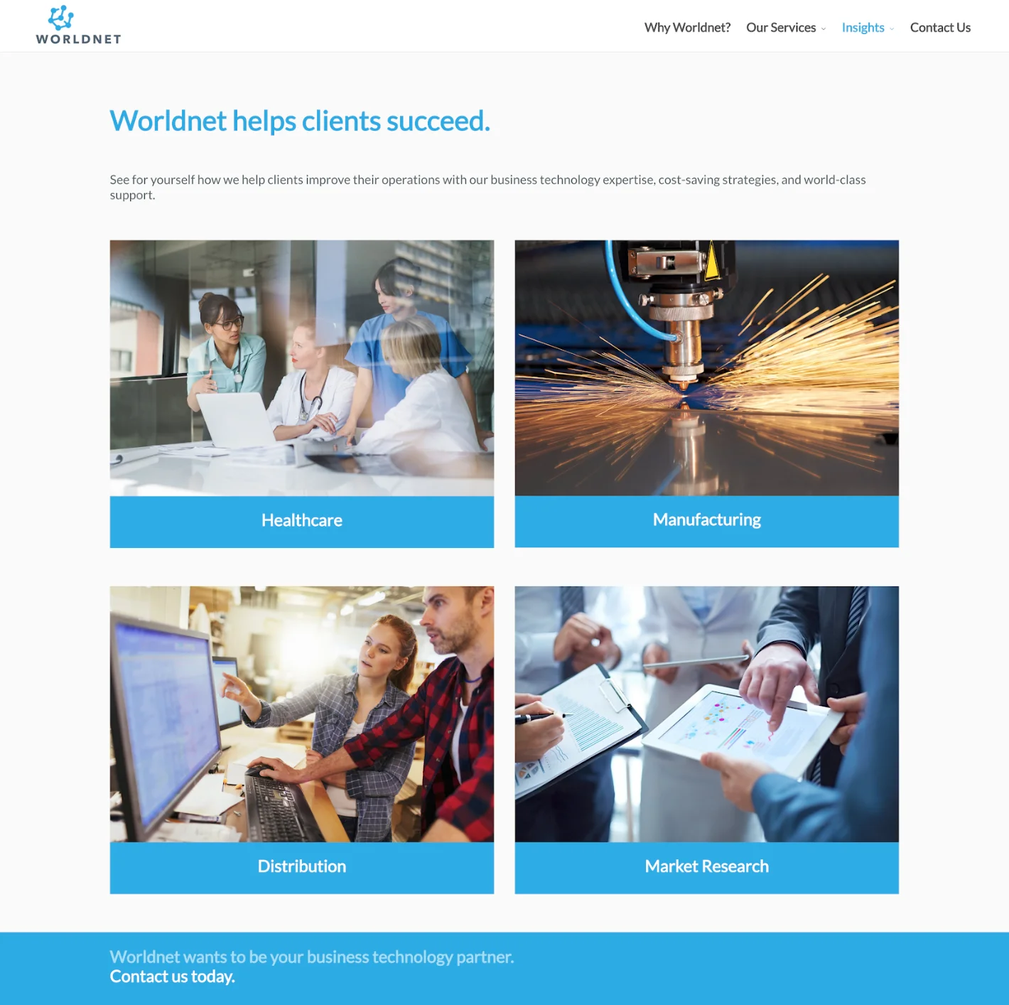 WorldNet Solutions sought a strategic partner to redesign their site, enhancing its modern aesthetic and user experience while preserving the value of their recently updated content.